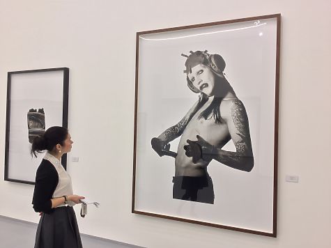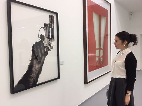 — Скорее в Америке. Я вообще много работал с шимпанзе — мне нравятся эти животные, из-за того что с ними легко коммуницировать. Они повторяют твои движения, жесты, мимику. Если закричать — шимпанзе тоже будет кричать. Смысл фото читается легко: я хотел показать, насколько опасно дать обезьяне ружье, а это происходит повсеместно. Но я хочу отметить, что в этом снимке важна графика и режиссура, которые я изучал еще в университете и постоянно применяю в своих работах. Во всех моих снимках есть кинематографичность, графика или сочетание и того и другого. Этот снимок (указывает на одно из фото в экспозиции) построен по законам кино: на первом плане хмурая девушка, над горизонтом нависает такая же хмурая туча, а за ее спиной автомобиль, где веселятся ее друзья. Зритель сразу думает: что случилось с этой девушкой, почему она не веселится с ними? Или на этом фото (подходит к соседнему снимку) девушка в вечернем платье стоит рядом с мотоциклом, хотя логичнее было бы, если бы рядом был лимузин. У нас опять вопрос: откуда этот диссонанс, где ее шикарное авто? В фотографии с револьвером и обезьяной меня тоже волновал контраст и смысловой, и визуальный, графический. Чтобы его достичь, я использую разную печать: серебряно-желатиновую печать, ирис-принт и т.д. Многие фотографы сейчас отправляют фото по почте, а галерея их печатает как хочет. Я всегда печатаю фотографии сам.