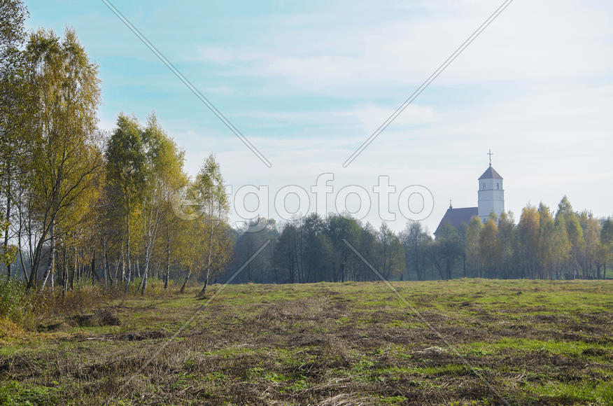 Солнечный октябрьский день. Скошенный луг и уже начавшие терять листву лесополосы. На заднем плане старинная каменная церковь.