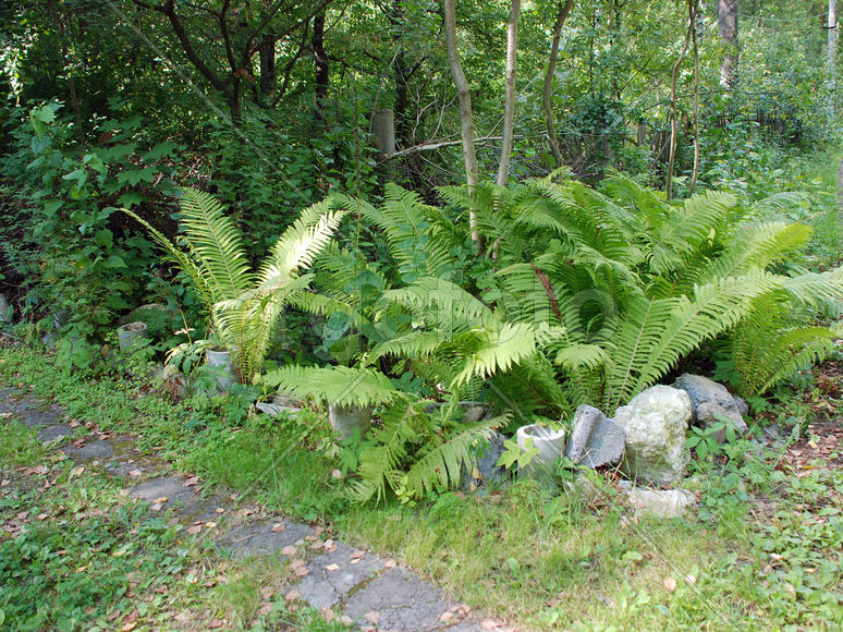 Пышный куст папоротника растет возле тропинки в подмосковном лесу