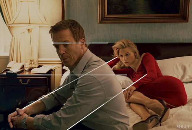 Да, облицовка камина точно совпадает сеткой правила третей. Значит, Энни Лейбовиц пользовалась им. Но как она расставляла моделей? Как ей удалось создать такую потрясающую композицию, когда в распоряжении были только горизонтальные и вертикальные линии? Что делать?