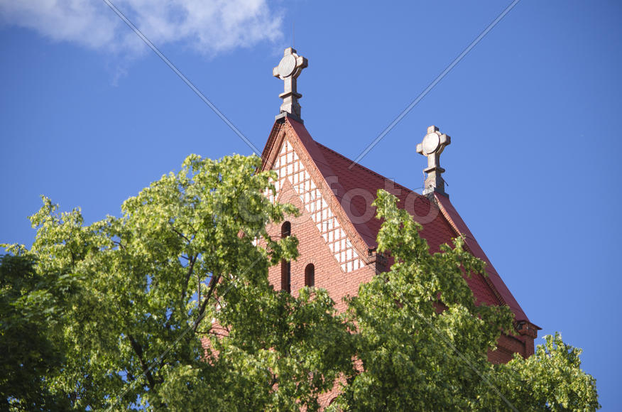 На фото изображен фрагмент башни костела Св. Симеона и Елены в Минске на фоне деревьев покрытых свежей зеленой листвой под голубым солнечным летним небом и белыми легкими облаками.
