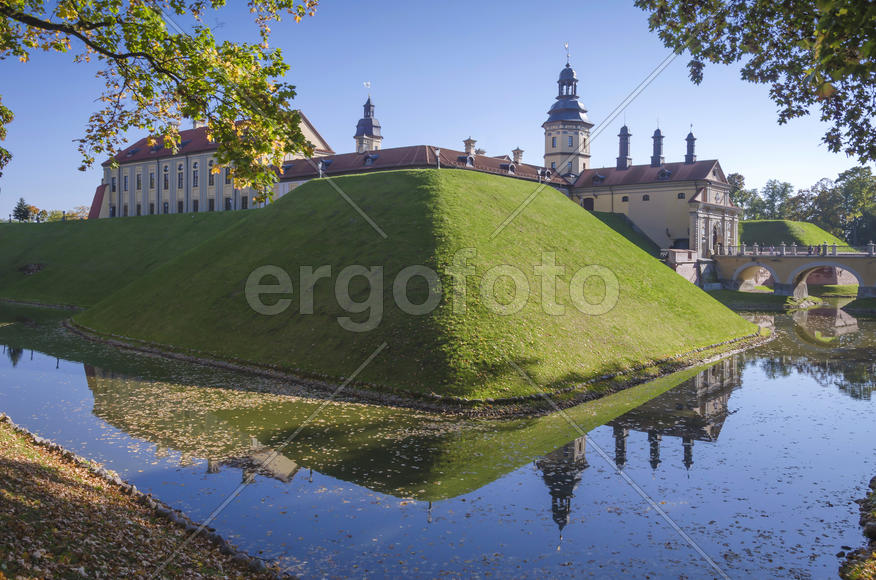 Старинный Несвижский замок за высоким оборонительным валом. Вал окружен заполненным водой рвом в спокойной глади которой отражается замок и чистое, голубое небо. Вал порос зеленой травой. Ранняя осень.