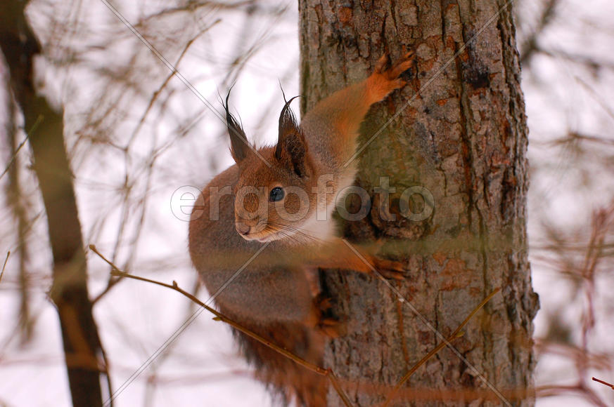 Белка с мокрыми ушами сидит на дереве. Снег подтаял из-за оттепели, поэтому уши у белки мокрые.