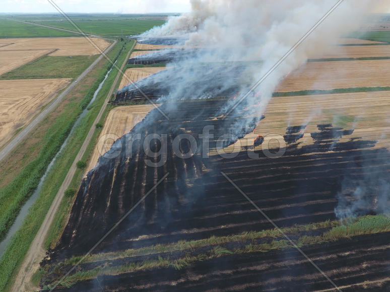Burning straw in the fields of wheat after harvesting. The pollution of the atmosphere with smoke.