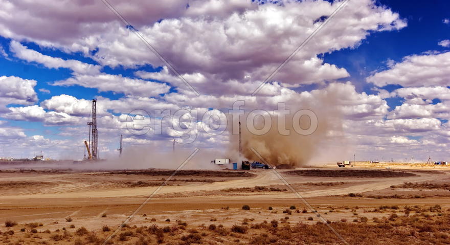 Пыльная буря в степи Бетпакдала, Казахстан..