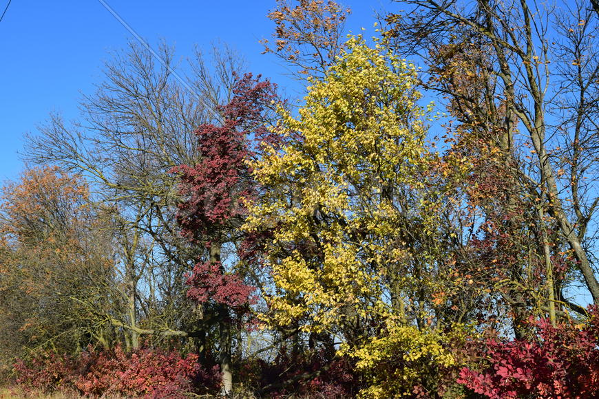Color of leaves of cotinus coggygria and wild apricot. Trees in a forest belt in the fall