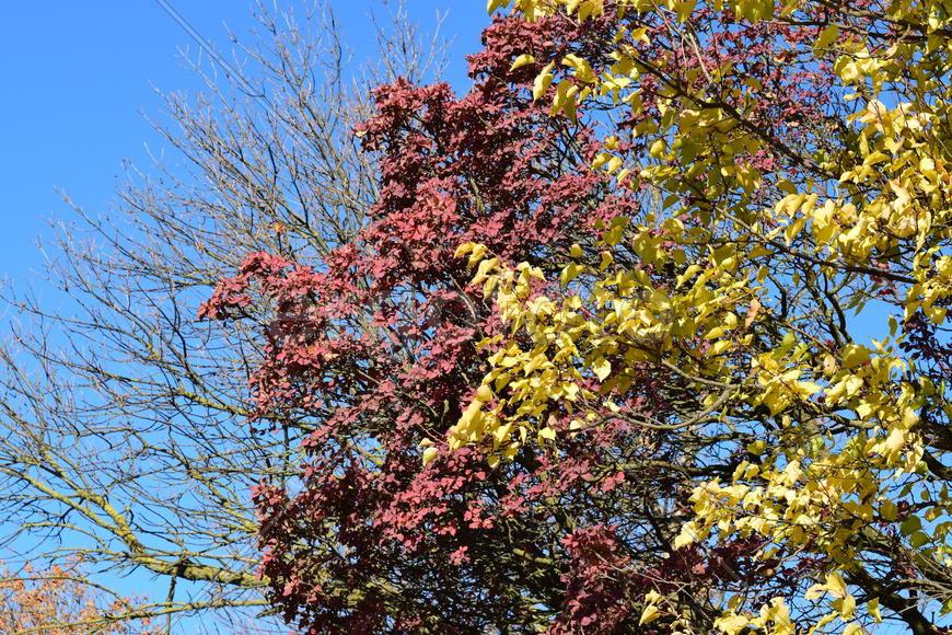 Color of leaves of cotinus coggygria and wild apricot. Trees in a forest belt in the fall