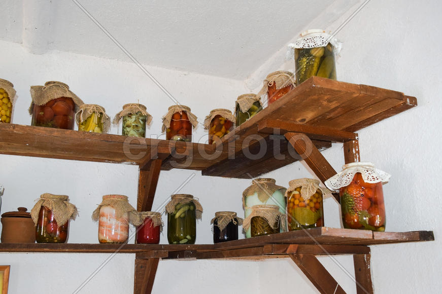 House canned food from vegetables. Stocks of food of residents of the Russian village.