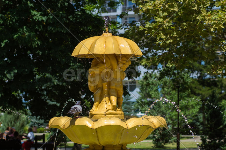 голубь прилетел к фонтану в жаркий день