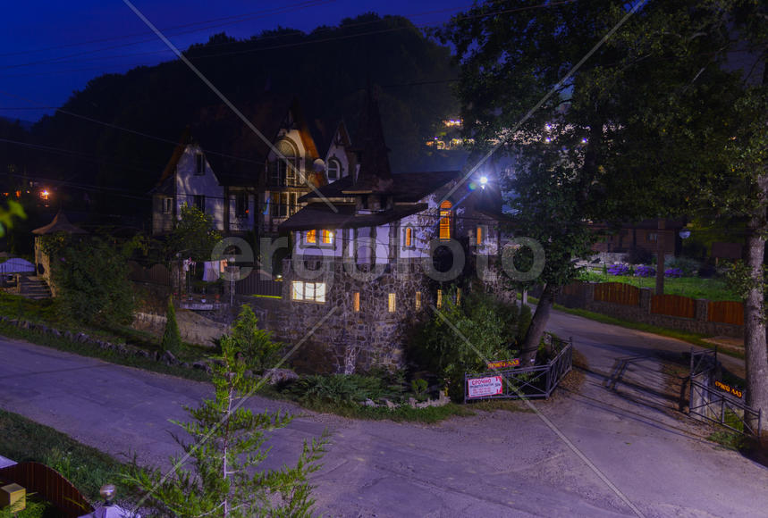 Residential private house in a mountain village at night