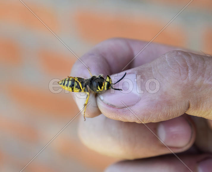 Common wasp on pinched fingers. Caught wasp.