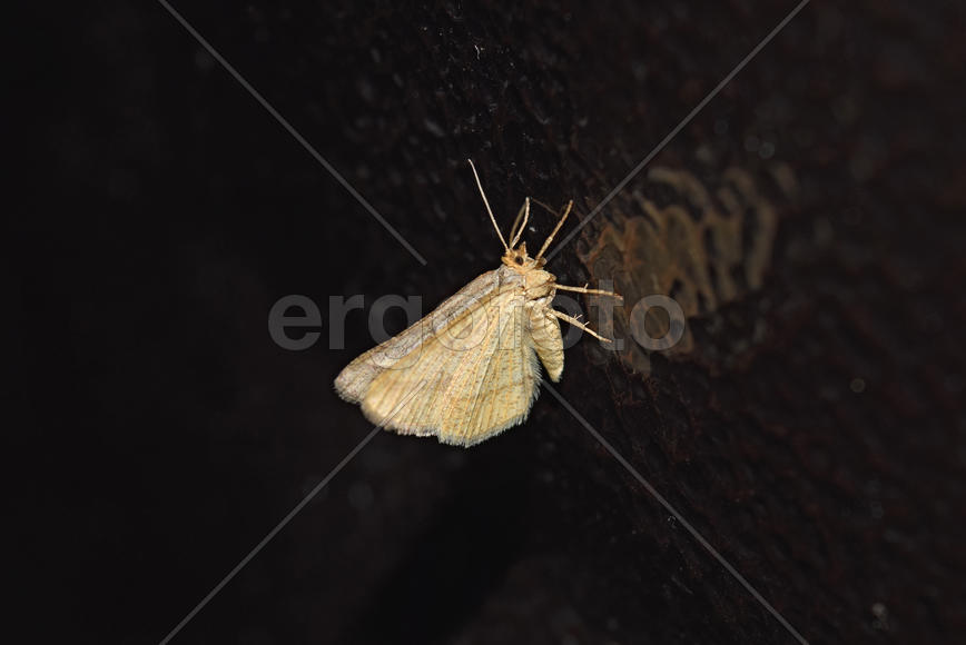 White night butterfly on the painted metal surface. Moths are drawn to the light.