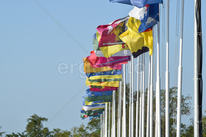 Russia, Ataman - 26 September 2015: A number of different flags with coats of arms and banners. Flags hanging in the Cossack village of Ataman.