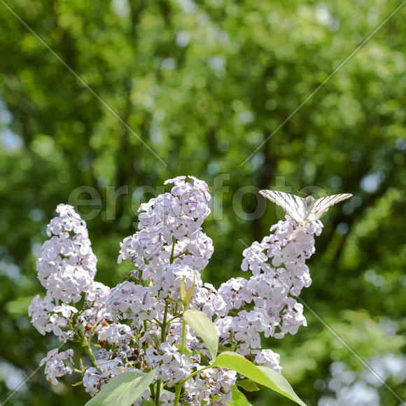 Swallowtail butterfly. Butterfly white sailboat on the flowers of lilac. Insect pollinators.