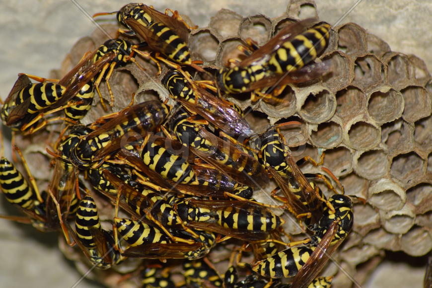 Wasp nest with wasps sitting on it. Wasps polist. The nest of a family of wasps which is taken a close-up.