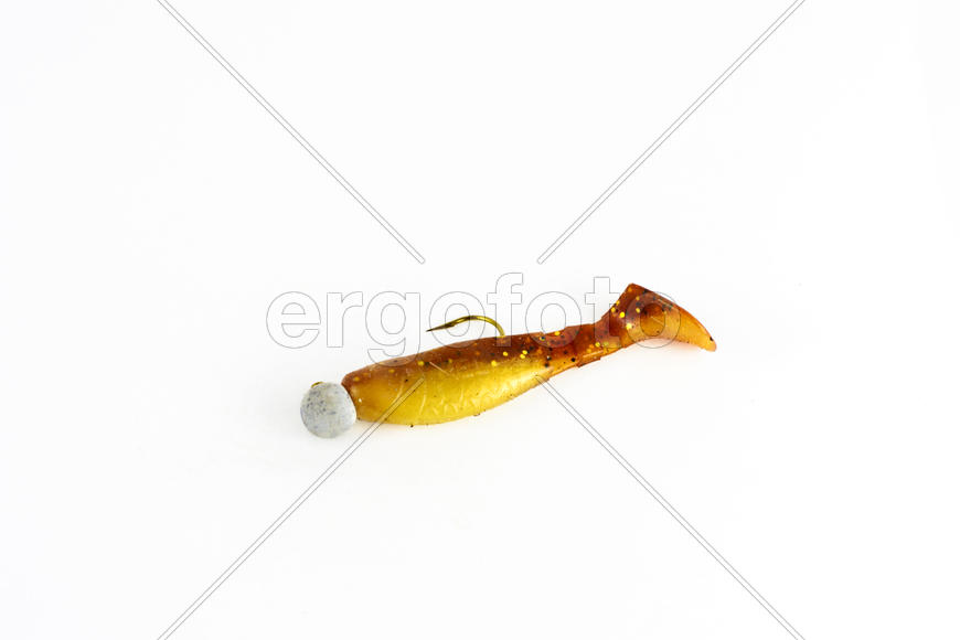 Exhibition of pirated copies of fishing metal spoon baits. Bait for fishing in the shape of a spoon with a hook on a white background