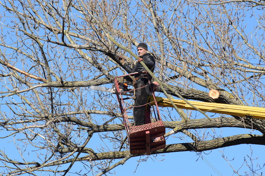 Pruning trees using a lift-arm. Chainsaw Cutting unnecessary branches of the tree. Putting in order