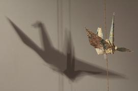 Две гирлянды журавликов сложенных из разноцветной бумаги в технике оригами подвешаны ветрикально на фоне деревянной темно-кричневой стены. Журавлики желтые, салатовые, голубые, красные и оранжевые.