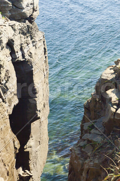 Rocks and sea meet in the bright sunlight in autumn