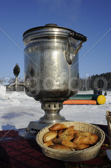 boiling samovar in a snowy field lit by the sun and a basket of cakes