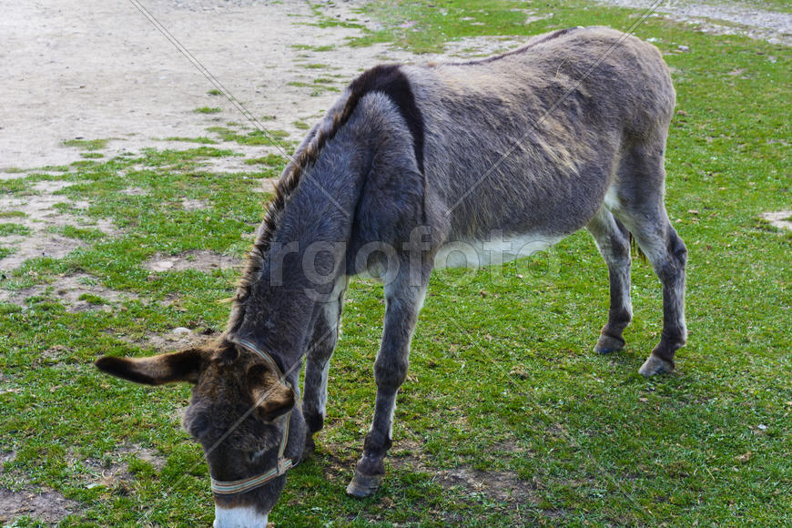 Серый ишак на зеленой лужайке