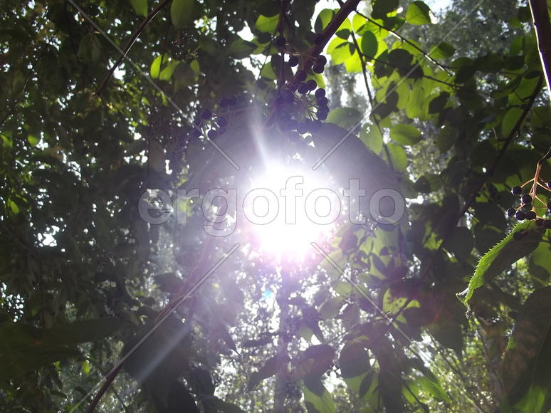 Лучики солнца пробиваются сквозь листья и плоды черёмухи