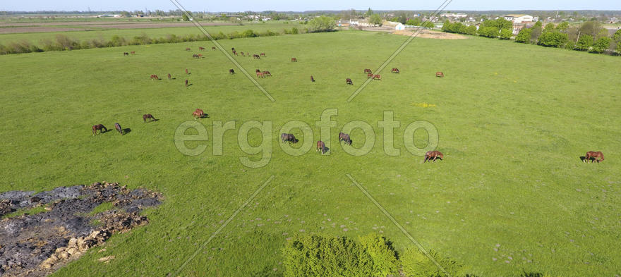 Grazing horses on the field. Shooting horses from quadrocopter. Pasture for horses
