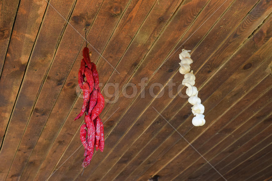 Drying hanging onion bulbs. Vegetables from his garden.