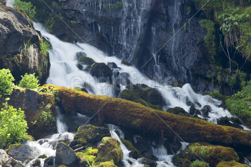 The falls in mountains flow from above and rustle