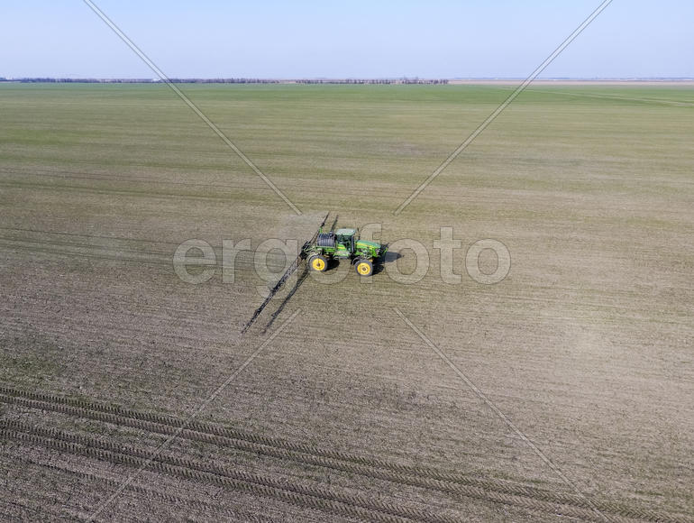 Tractor with hinged system of spraying pesticides. Fertilizing with a tractor, in the form of an aerosol, on the field of winter wheat