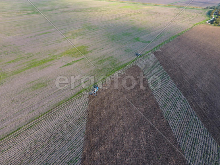 Top view of the tractor that plows the field. disking the soil. Soil cultivation after harvest.