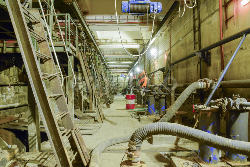 Basement of a water pumping station. Abandoned post-apocalyptic view of the basement pumping rooms.
