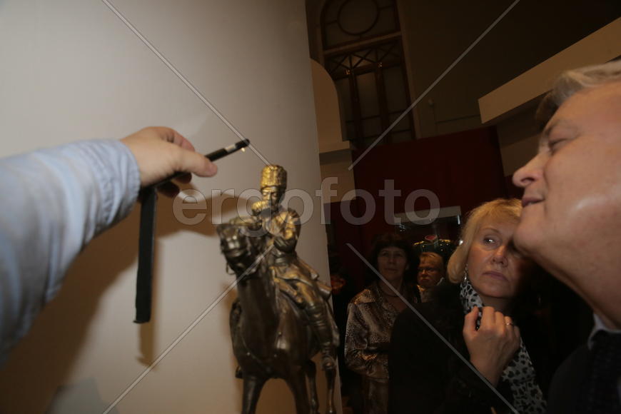Зам.министра обороны РФ Николай Панков у миниатюры "Казак, закуривающий трубку" разглядывает бронзовую спичку. Выставка "К пользе и славе России" в ГИМ.