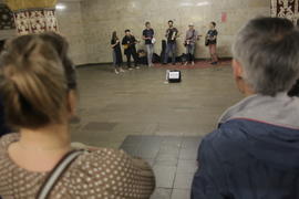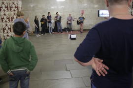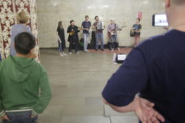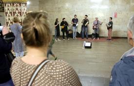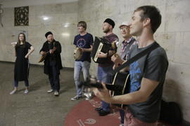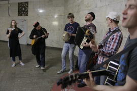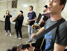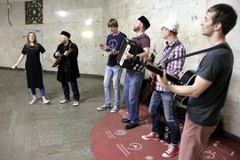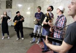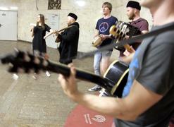 Музыканты ансамбля "Люди вольные" выступают на станции метро "Комсомольская". Москва. Россия