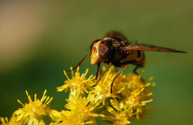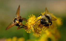 Муха-журчалка и шмель сидят на желтом цветке и пьют нектар