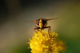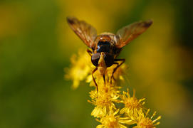 Муха-журчалка сидит на желтом цветке и пьёт сладкий нектар