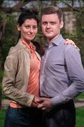 жених и невеста на лестнице держатся за руки
