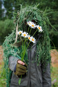 Снайпер в масировочном костюмегилли с букетом ромашек