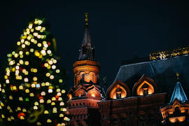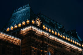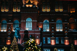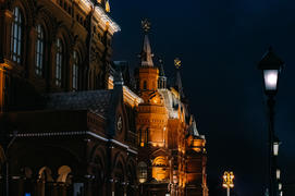 Москва. Старинное здание освещенное огнями в ночное время суток