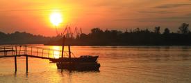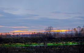 Пейзаж вечернего заката на реке Волга с неоновым цветом