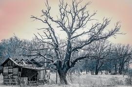 Разрушенный дом и сухое дерево на фоне леса
