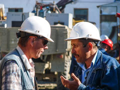 Обсуждение технических специалистов. Сотрудники компании в белых касках.