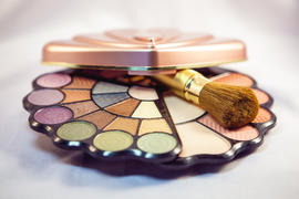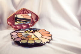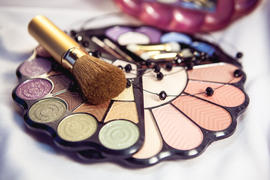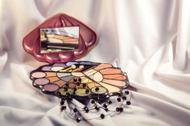 Косметика розового цвета, включая шпильки и другие мелочи. На белом фоне.