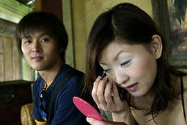 Девушка красится, а мужчина наблюдает за фотографом