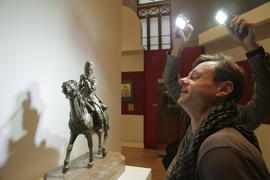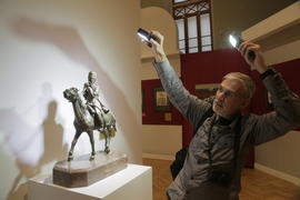 Московский фотограф Дмитрий Коробейников пытается осветить скульптуру.