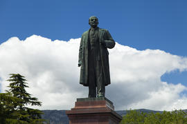 The monument to Lenin is among palm trees and against the bright blue sky