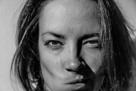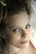 Молодая девушка с ярко-голубыми глазами смотри в камеру