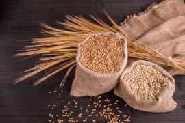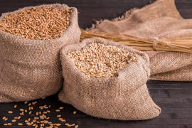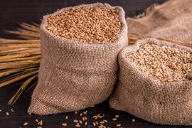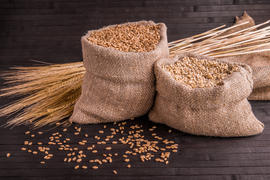 Зерна пшеницы и овсянки в мешочках на темном фоне