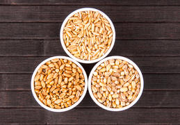 Пшеница, овсянка и перловка в круглых пиалках на темном фоне