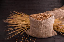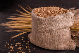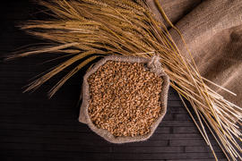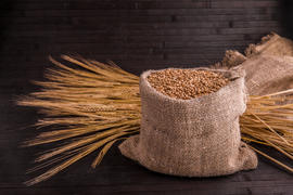 Пшеница в мешочке крупным планом с колосками на темном фоне